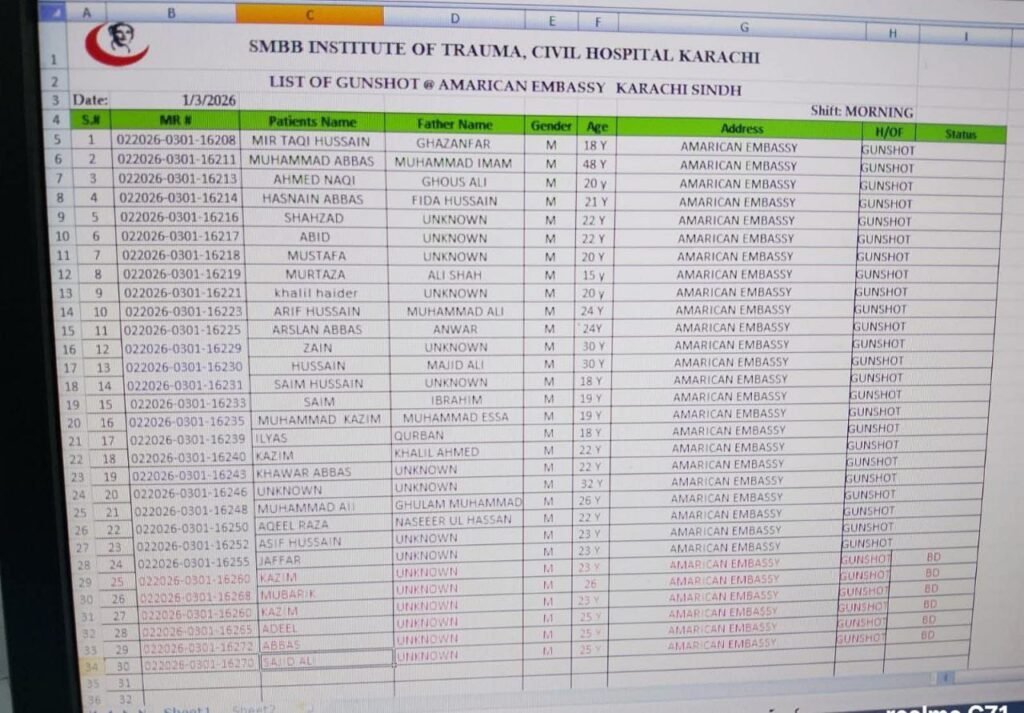 लाठी-डंडों से लैस पाकिस्तानी भीड़ ने US काउंसुलेट की खिड़की और दरवाज़ों पर लगे शीशे तोड़ने की ख़ूब कोशिश की लेकिन ये शीशे टूटे नहीं….इसके बाद लोगों ने टायर और दूसरे सामान लगाकर वहां आग लगा दी….प्रदर्शनकारियों ने यूएस काउंसुलेट के अंदर ईरान का झंडा लहरा दिया….जब भीड़ का हमला और तेज़ हो गया तो काउंसुलेट के अंदर मौजूद अमेरिकी फोर्सेज़ ने फायरिंग शुरू कर दी….अमेरिकी सिक्योरिटी फोर्स की फायरिंग से डर कर भीड़ काउंसुलेट एरिया से बाहर भाग गई….लेकिन बाहर उनका बवाल, उनका विरोध प्रदर्शन जारी रहा। अब ये समझिये कि पाकिस्तान में अमेरिका के खिलाफ इतना बड़ा प्रोटेस्ट हो जाए और पाकिस्तानी गर्वमेंट उसे बर्दाश्त कर ले। ये भला कैसे हो सकता था। तो कराची पुलिस ने यूएस काउंसुलेट पर हमला करने वाली भीड़ पर ताबड़तोड़ गोलियां बरसानी शुरू कर दी।ये कोई हवाई फायरिंग नहीं थी। ये फायरिंग इसलिए नहीं थी कि भीड़ वहां से भाग जाए, ये डायरेक्ट फायरिंग थी। सीधे लोगों को निशाना बनाते हुए गोलियां चलाई जा रही थीं…कराची पुलिस प्रदर्शनकारियों को घसीट रही थी। उन्हें घेर-घेर कर मार रही थी, क्यों- क्योंकि वो अमेरिका और इज़रायल के हमलों का विरोध कर रहे थे….पाकिस्तानी गर्वमेंट के मुताबिक इस फायरिंग में केवल 10 लोगों की जान गई है…लेकिन हकीकत इससे और भी भयानक है। सोशल मीडिया पर कराची सिविल हॉस्पिटल में भर्ती किये गये लोगों की एक लिस्ट सर्कुलेट की जा रही है। इस लिस्ट में 30 लोगों के नाम हैं जिनमें से 6 तो अस्पताल लाने से पहले ही मर चुके थे। घायलों में से अब तक कितनों की जान जा चुकी है उसका कोई डेटा अब तक नहीं बताया गया है|