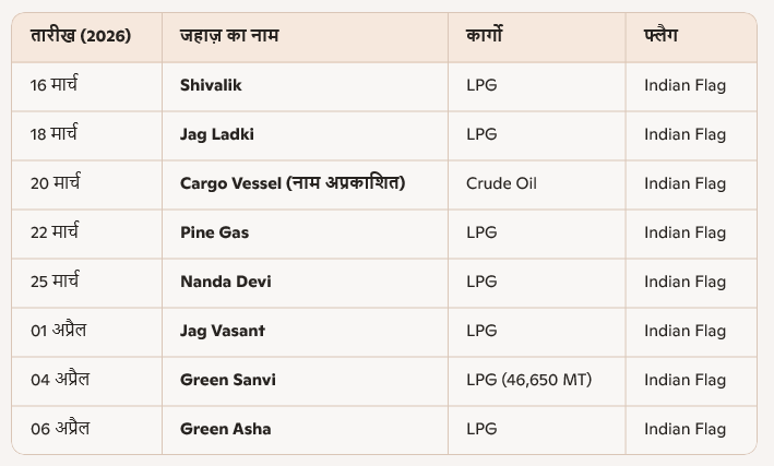 भारतीय-फ्लैग्ड जहाज़ों की डिटेल (मार्च–अप्रैल 2026)