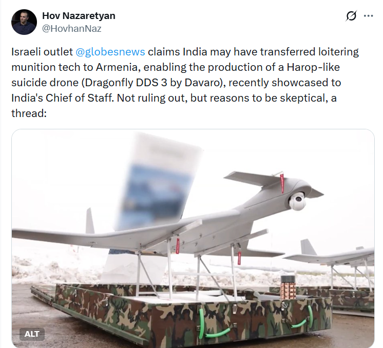 वहीं भारत से भेजे गये एंटी ड्रोन सिस्टम भी आर्मेनिया के लिए बहुत कारगर साबित हुए हैं। यहां तक तो अज़रबैजान बर्दाश्त कर रहा था लेकिन जब उसने आर्मेनिया का Dragonfly DDS 3 ड्रोन देखा तो वो बेकाबू हो गया। उसे लगा कि जिस इज़रायली ड्रोन की मदद से उसने जंग जीती थी, अब वो ड्रोन आर्मेनिया के पास भी पहुंच चुका है, वो भी भारत के रास्ते।असल में इज़रायल की एक न्यूज़ वेबसाइट ने भी कुछ ऐसी ही ख़बर पब्लिश की थी। उसने हेडलाइन बनाई- आर्मेनिया ने IAI के हारोप जैसा दिखने वाला सुसाइड ड्रोन पेश किया …ख़बर में ये बताया गया कि भारत ने 2020 से 2024 के बीच इज़रायल से 20.5 बिलियन डॉलर के डिफेंस इक्विपमेंट्स और हथियार खरीदे हैं।और भारत के प्रधानमंत्री नरेंद्र मोदी की मेक इन इंडिया पॉलिसी की वजह से विदेशी कंपनियों को अपनी प्रोडक्शन लाइनें और टेक्नोलॉजी भारत के साथ शेयर करनी पड़ती हैं और इस तरह भारत इम्पोर्टर से इंडिपेन्डेंट डिफेंस एक्सपोर्टर बन जाता है और ये इज़रायल के हितों को चुनौती देता है जैसा अभी आर्मेनिया में हो रहा है।असल में IAI भारत में अडाणी डिफेंस के साथ मिलकर Harop ड्रोन का प्रोडक्शन कर रहा है। इसलिए आरोप लग रहे हैं कि भारत ने आर्मेनिया को हारोप ड्रोन की टेक्नोलॉजी या फिर उससे मिलता जुलता ड्रोन दे दिया।अब तक इसका जवाब भारत की तरफ से तो नहीं आया है लेकिन आर्मेनिया के फॉरेन अफेयर्स और सिक्योरिटी से जुड़े मामलों के एक्सपर्ट Hov Nazaretyan ने भारत के खिलाफ चलाए जा रहे इस प्रोपेगेंडा का अपने ट्वीट थ्रेड से जबरदस्त जवाब दिया है।उन्होंने अपने पहले ट्वीट में लिखा इज़राइली आउटलेट ग्लोब्स न्यूज़ का दावा है कि भारत ने शायद आर्मेनिया को लोइटरिंग म्यूनिशन टेक ट्रांसफर की है, जिससे हारोप जैसा सुसाइड ड्रोन (Davaro का Dragonfly DDS 3) बनाना मुमकिन हो सका, जिसे हाल ही में भारत के चीफ ऑफ स्टाफ को दिखाया गया था। इस बात से इनकार नहीं किया जा रहा है, लेकिन शक करने की वजहें हैं, एक थ्रेड:-Hov ने आर्मेनिया के Davaro Defense Systems के डायरेक्टर David Galoyan के उस ट्वीट को रिट्वीट किया जो उन्होंने 4 अप्रैल 2021 को किया था।