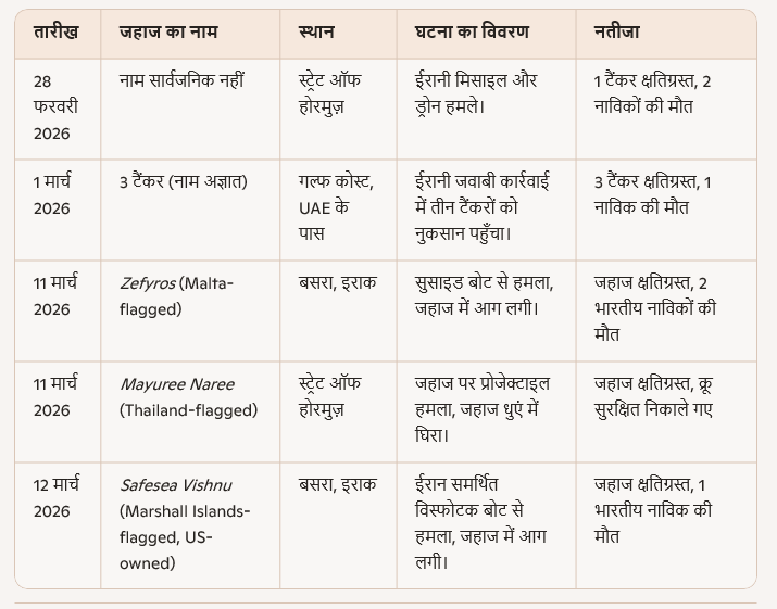 अब तक US–Iran–Israel संघर्ष में कम से कम 16 जहाजों को नुकसान पहुंचा है। इनमें तेल टैंकर, कार्गो शिप और बल्क कैरियर शामिल हैं। प्रमुख घटनाएँ फरवरी–मार्च 2026 में हुईं, जिनमें Safesea Vishnu, Zefyros और थाईलैंड-फ्लैग वाला Mayuree Naree जैसे जहाजों पर हमले हुए।