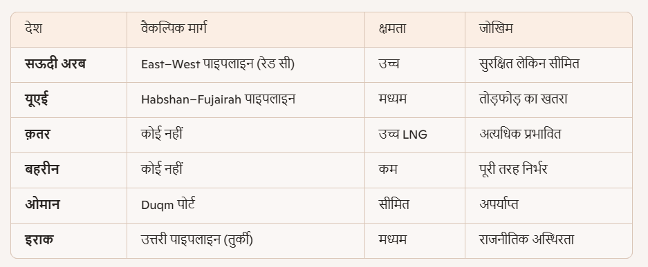 ईरान के होरमुज़ जलडमरूमध्य के बंद करने के फैसले का तेल बाज़ार पर सीधा और गंभीर असर पड़ा है। यह जलडमरूमध्य वैश्विक तेल और LNG व्यापार का लगभग 20% हिस्सा संभालता है, इसलिए इसके बंद होने से आपूर्ति बाधित हो गई है और कीमतों में तेज़ उछाल देखा गया। रिपोर्ट्स के अनुसार, कई तेल और गैस टैंकरों ने मार्ग बदल लिया या वापस लौट गए, जिससे बाज़ार में अनिश्चितता और अस्थिरता बढ़ गई। वैश्विक स्तर पर तेल की कीमतों में 7% से अधिक की वृद्धि दर्ज की गई है और शिपिंग बीमा लागत भी बढ़ रही है। भारत जैसे आयातक देशों के लिए यह स्थिति ऊर्जा सुरक्षा पर बड़ा खतरा है, जिससे रणनीतिक भंडार का उपयोग करने की संभावना बढ़ गई है। मध्य-पूर्व देशों ने अपने-अपने विकल्प अपनाए हैं—सऊदी अरब ने East–West पाइपलाइन का उपयोग शुरू किया है, यूएई ने Habshan–Fujairah पाइपलाइन सक्रिय की है, जबकि क़तर और बहरीन के पास कोई वैकल्पिक मार्ग नहीं होने के कारण वे सबसे अधिक प्रभावित हैं। ओमान Duqm पोर्ट का सहारा ले रहा है, लेकिन उसकी क्षमता सीमित है, और इराक उत्तरी पाइपलाइन के ज़रिए तेल तुर्की तक पहुँचाने की कोशिश कर रहा है, हालांकि राजनीतिक अस्थिरता वहाँ एक बड़ी चुनौती बनी हुई है। इस प्रकार, ईरान के इस कदम ने न केवल तेल आपूर्ति को बाधित किया है बल्कि वैश्विक ऊर्जा बाज़ार को अस्थिर कर दिया है।