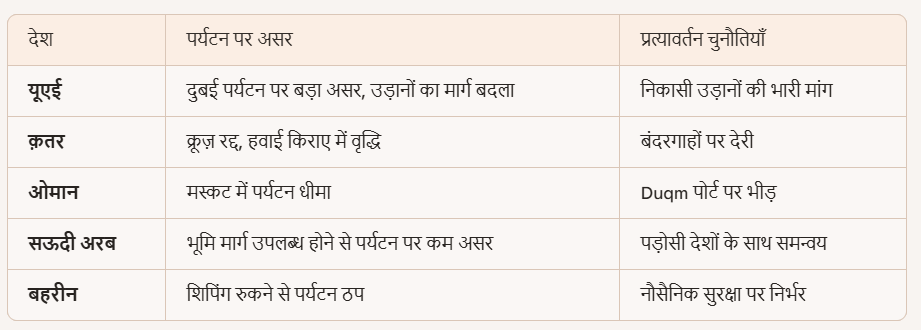 होरमुज़ जलडमरूमध्य बंद होने से पर्यटन पर भी गहरा असर पड़ा है। एयरलाइंस को खाड़ी क्षेत्र से बचते हुए लंबा मार्ग अपनाना पड़ रहा है, जिससे यात्रा समय और लागत बढ़ गई है और हवाई किराए में तेज़ी आई है। क्रूज़ कंपनियों ने सुरक्षा जोखिमों के कारण अपनी सेवाएँ स्थगित कर दी हैं, जिससे क़तर और बहरीन जैसे देशों में पर्यटन लगभग ठप हो गया है। ओमान में मस्कट और Duqm पोर्ट पर भीड़ बढ़ने से पर्यटन धीमा हो गया है। यूएई में दुबई जैसे बड़े पर्यटन केंद्रों पर उड़ानों के मार्ग बदलने और टिकट कीमतों में इज़ाफा होने से पर्यटकों की संख्या घट रही है। सऊदी अरब में भूमि मार्ग उपलब्ध होने के कारण पर्यटन पर दूसरे देशों की तुलना में कम असर पड़ा है, लेकिन क्षेत्रीय अस्थिरता ने पर्यटकों की संख्या कम कर दी है। कुल मिलाकर, इस संकट ने क़तर, बहरीन और यूएई जैसे देशों के पर्यटन को सबसे अधिक नुकसान पहुँचाया है, जबकि दूसरे देशों की तुलना मेंं सऊदी अरब और ओमान में असर सीमित रहा है।