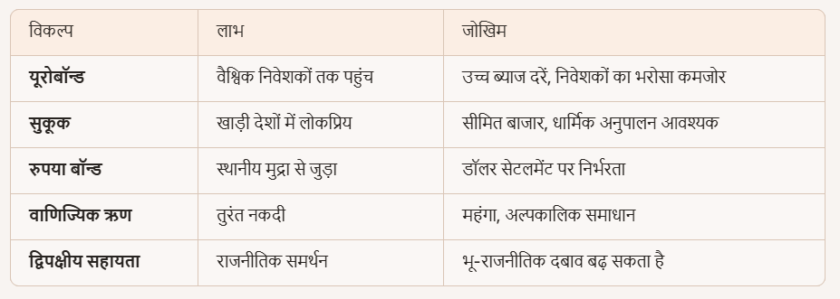 पाकिस्तान के वित्त मंत्री मुहम्मद औरंगज़ेब ने वाशिंगटन डी.सी. में आयोजित IMF और वर्ल्ड बैंक की वार्षिक बैठक के दौरान स्पष्ट किया कि देश अपने विदेशी मुद्रा भंडार को मज़बूत करने के लिए कई वित्तीय विकल्पों पर विचार कर रहा है। उन्होंने रॉयटर्स को बताया कि पाकिस्तान यूरोबॉन्ड, इस्लामिक सुकूक और डॉलर-सेटल्ड रुपया-लिंक्ड बॉन्ड जारी करने पर विचार कर रहा है। इसके अलावा, इस वर्ष यूरोबॉन्ड जारी करने की योजना है और साथ ही कमर्शियल लोन लेने की संभावना भी देखी जा रही है। पाकिस्तान इस महीने यूएई को 3.5 अरब डॉलर लौटाएगा, जिससे विदेशी मुद्रा भंडार पर दबाव बढ़ेगा। आपको बता दें कि पाकिस्तान का अनुमानित GDP वृद्धि ~4% और रेमिटेंस $41.5 अरब है जो इस झटके को संभाल सकते है। ऐसे मेें आईएमएफ बोर्ड इस महीने के अंत या अगले महीने की शुरुआत में लगभग $1.3 अरब डॉलर की नई किश्त को मंज़ूरी दे सकता है। इसके अलावा अगले महीने पाकिस्तान पहली बार पांडा बॉन्ड (चीनी युआन में) $250 मिलियन का इश्यू कर सकता है, जिसे एशियाई विकास बैंक और एशियाई इंफ्रास्ट्रक्चर निवेश बैंक का समर्थन मिलेगा। चलिए आपको बताते हैं पाकिस्तान के संभावित वित्तीय विकल्प क्या हो सकते हैं।