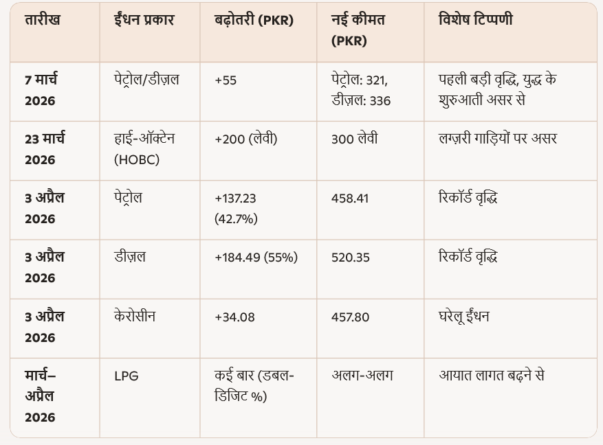 पाकिस्तान में पेट्रोल और डीज़ल की कीमतों में एक बार फिर जबरदस्त बढ़ोतरी की गई है। यह पिछले एक महीने में दूसरी बार है जब सरकार को ईंधन के दाम बढ़ाने पड़े हैं। बढ़ती अंतरराष्ट्रीय तेल कीमतों और मिडिल ईस्ट में जारी तनाव को इसका मुख्य कारण बताया जा रहा है। सरकार द्वारा जारी नए रेट के अनुसार डीज़ल: 54.9% बढ़कर 520.35 रुपये प्रति लीटर और पेट्रोल: 42.7% बढ़कर 458.40 रुपये प्रति लीटर पर आ गया है। तेल की कीमतों में हो रही बढ़ोतरी सीधे आम जनता की जेब पर असर डालने वाली है। यही नहीं इसकी वजह से महंगाई भी और ज्यादा बढ़ेगी क्योंकि ट्रांसपोर्टेशन कॉस्ट बढ़ जाएगाI