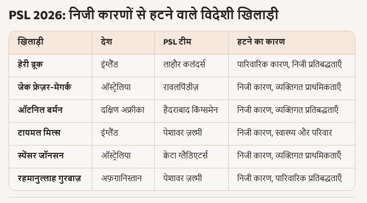 PSL 2026 में विदेशी खिलाड़ियों का पलायन सबसे बड़ी चुनौती बनकर सामने आया है। अब तक कम से कम 8–10 विदेशी खिलाड़ी PSL से हट चुके हैं, जिनमें से कई ने IPL को चुना है। कुछ ऑस्ट्रेलियाई और इंग्लिश खिलाड़ियों ने सुरक्षा चिंताओं और शेड्यूल टकराव का हवाला दिया। वेस्टइंडीज के कुछ खिलाड़ियों ने निजी कारणों से नाम वापस लिया।