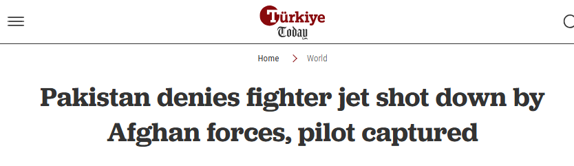 तोलो न्यूज़ ने उसी प्लेन की तस्वीर को पाकिस्तानी जेट के शॉट डाउन की ख़बर के साथ अटैक कर पोस्ट कर दिया है।तोलो न्यूज़ ने उसी प्लेन की तस्वीर को पाकिस्तानी जेट के शॉट डाउन की ख़बर के साथ अटैक कर पोस्ट कर दिया है। अफगानिस्तान से जुड़े S हैदर हाशमी नाम के X हैंडल ने एक ट्वीट किया है जिसमें उन्होंने लिखा है कि –ब्रेकिंग न्यूज़ पहली बार इस्लामिक अमीरात के मुजाहिद्दीनों ने पाकिस्तानी फाइटर जेट को मार गिराया है और पायलट को जिंदा पकड़ लिया गया है।
